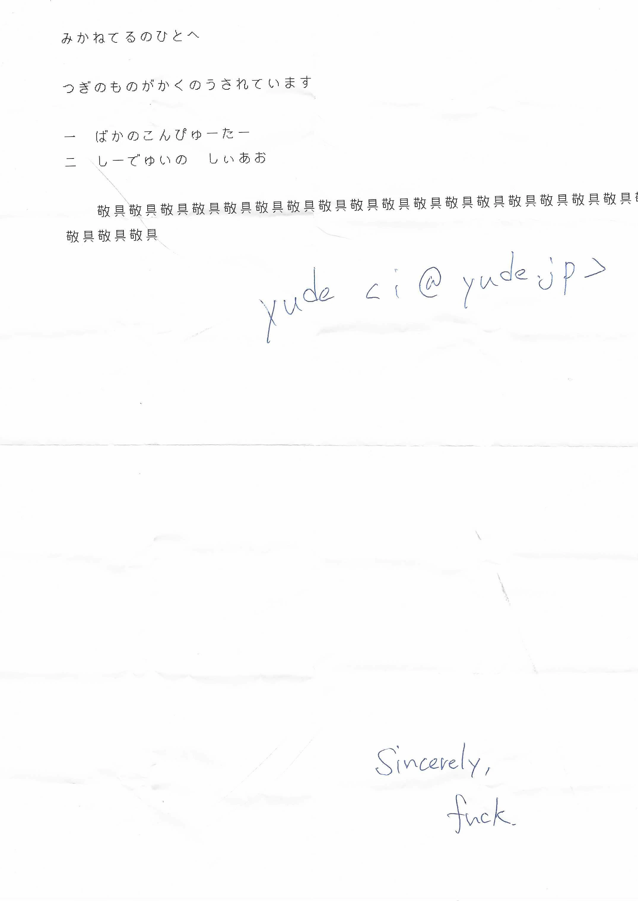 みかんちゃんから送信される物理的なメールでパケットやファクを受け取ることによって、怪文書を得ることができます。 それは完全に特徴的なオリジナルで、固有です。 世界にコピーはありません。 それを額縁に入れ、壁の上に置くことができます。 再生紙にもなります。